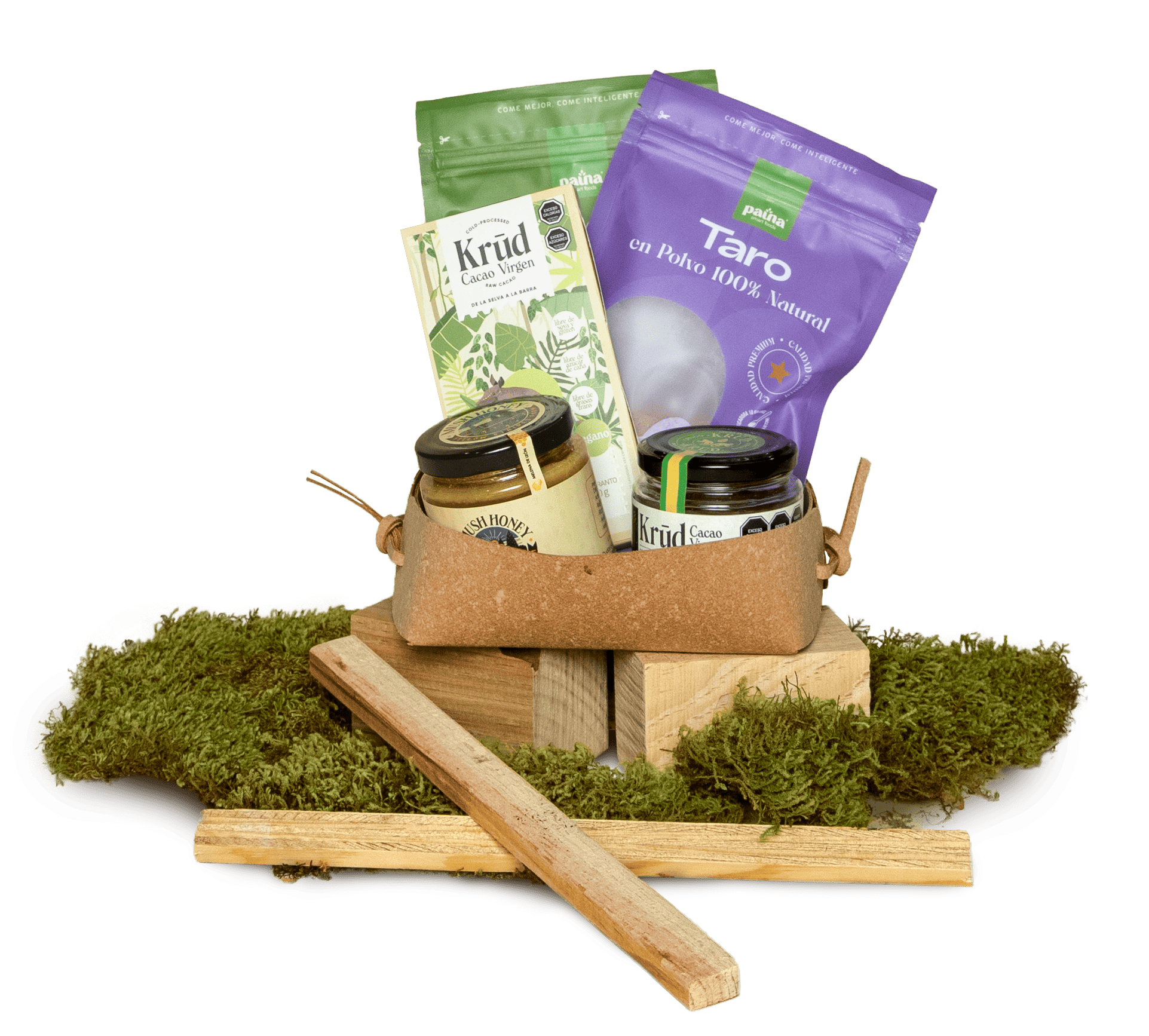 Contiene: Matcha en polvo 100% natural Taro en polvo 100% natural Barra de Cacao Virgen Miel de abeja con adaptógenos Untable de cacao KETO endulzado con Monk Fruit